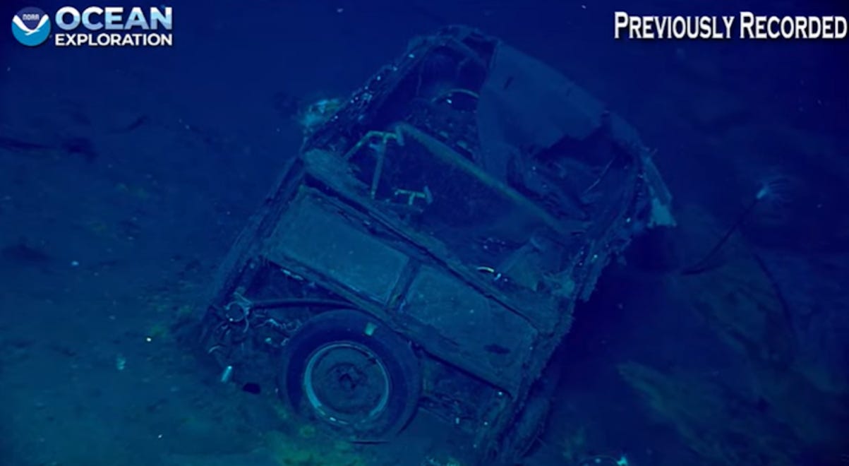 A deep water survey investigating a US aircraft carrier sunk by the Japanese during WWII was surprised to find a mystery car at the bottom of the Pacific Ocean. The National Oceanic and Atmospheric Administration is asking for help in identifying the vehicle that went down with the USS Yorktown during the Battle of Midway in 1942.