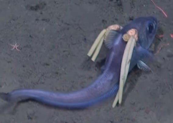 🐟 The sea’s a weird place and it just got a little weirder after scientists on an expedition to the South Sandwich Islands near Antarctica spotted a bizarre creature with parasitic pig tails. In a video from the Schmidt Ocean Institute, two copepods - small crustaceans - are seen positioned on either side of a deep sea rattail fish’s head. Long egg sacs attached at the back of the parasites make it look like the fish is sporting a nifty haircut. James Bernot, from the Smithsonian National Museum of Natural History, told Live Science:
