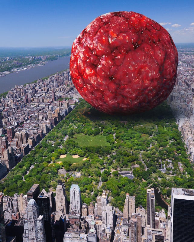 The result is nowhere near as big as I’d imagined, to be honest: the sphere of human goo would be just under 1km wide, weighing 500 tonnes. As you can see from the mock-up, the meatball is not small but will fit comfortably in New York’s Central Park…